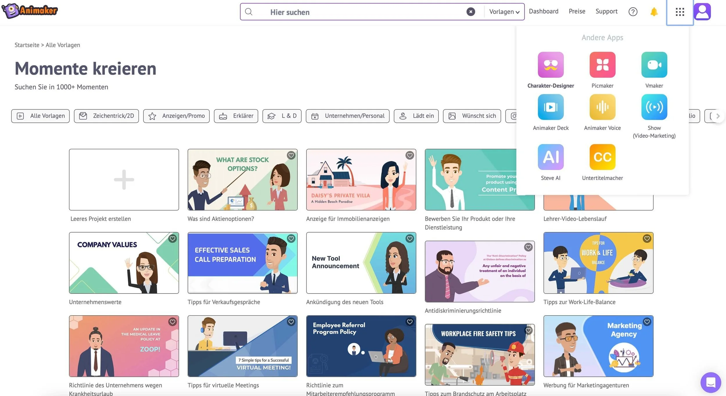 Okay, dann lass uns mal schauen, was Animaker alles so im Angebot hat, um Animations-Videos erstellen zu können. 👇