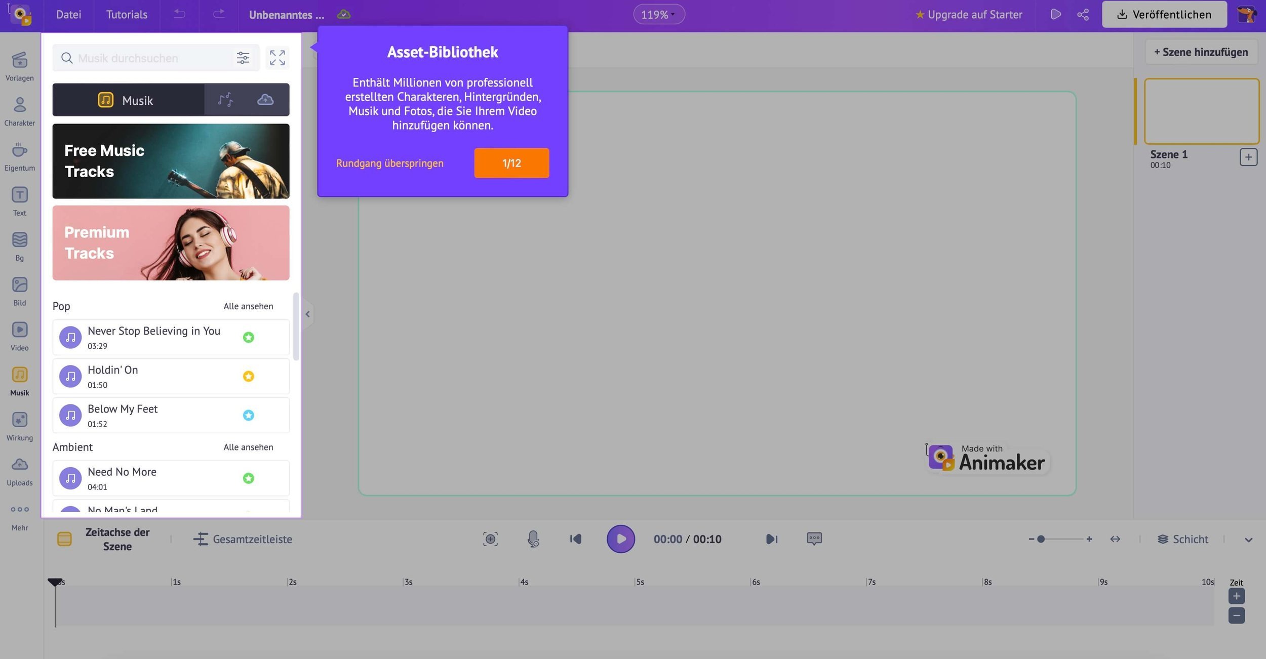 Bei Animaker gibt es eine Musik-Bibliothek, aus der du aus zig Liedern das Passende für dein Video raussuchen kannst.