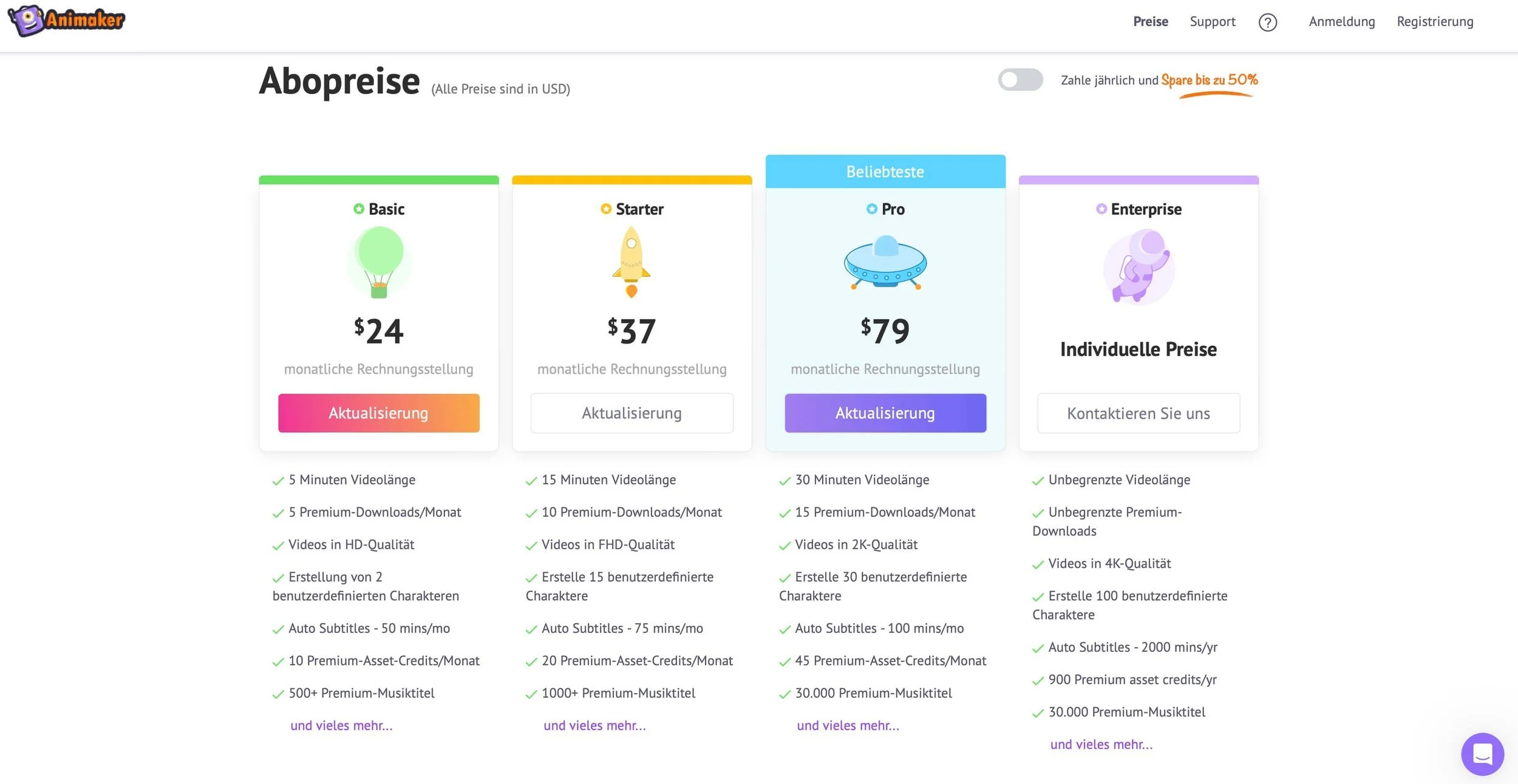 Ach ja, wenn du jährlich zahlst, gibt Animaker einen dicken Rabatt - fast 50 Prozent!