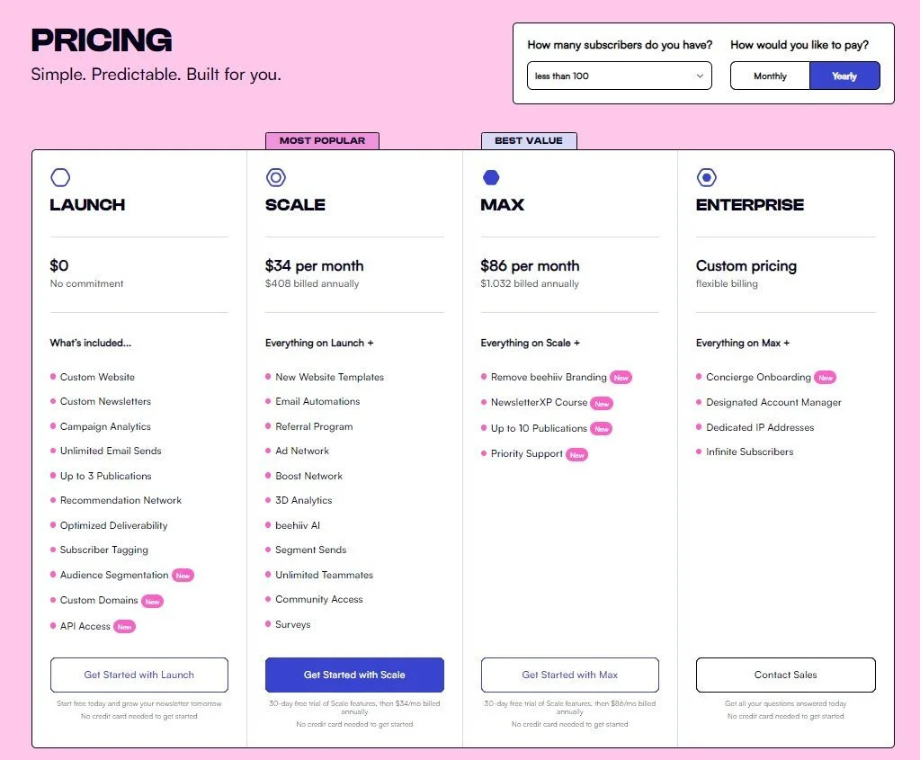 Für das Scale und Max Paket gibt es eine 30-tägige kostenfreie Testversion. Und die endet automatisch und du musst auch keine Kreditkarte hinterlegen. So kannst du dir erstmal in Ruhe anschauen, welche Features du tatsächlich brauchst und nutzt und ob du mit Beehiiv generell zurecht kommst.