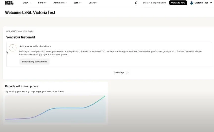 Hast du bestehende Abonnenten, ist es relativ einfach: Entweder du folgst den Anweisungen, als du Kit zum ersten Mal eingerichtet hast - also dann hast du bei der einen Frage angeklickt, dass du bereits Abonnenten hast. Oder du klickst im Dashboard auf “Start adding subscribers”.