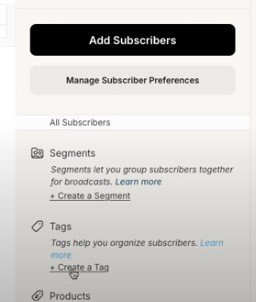 Als erstes wollen wir einen Tag einrichten. Dafür klickst du oben in der Navigation auf “Grow” und dann auf “Subscribers”. Natürlich hast du jetzt noch keinen.😅 Aber nichtsdestotrotz solltest du dir Tags kreieren.