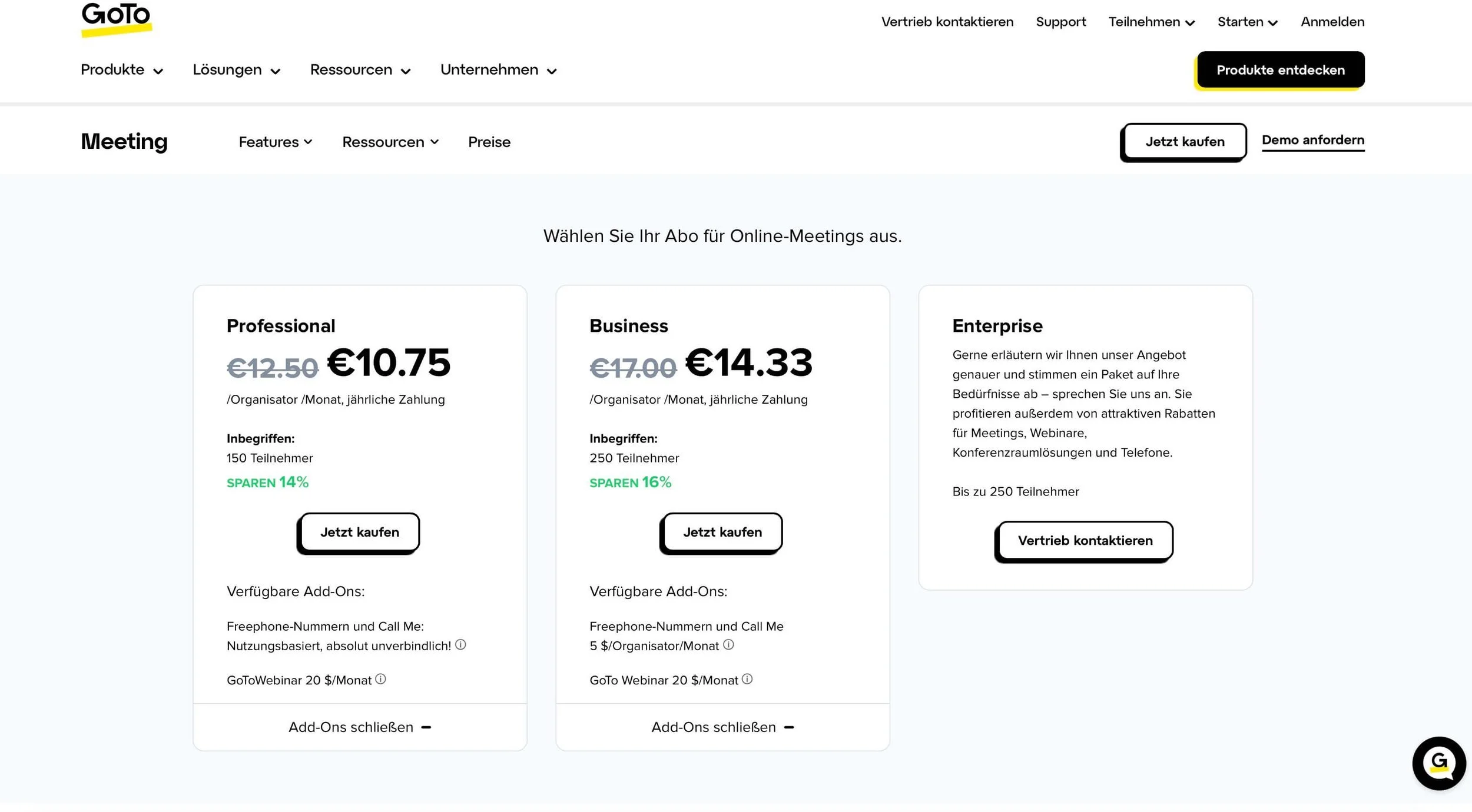 Es gibt drei verschiedene Pakete bei GoTo Meeting: