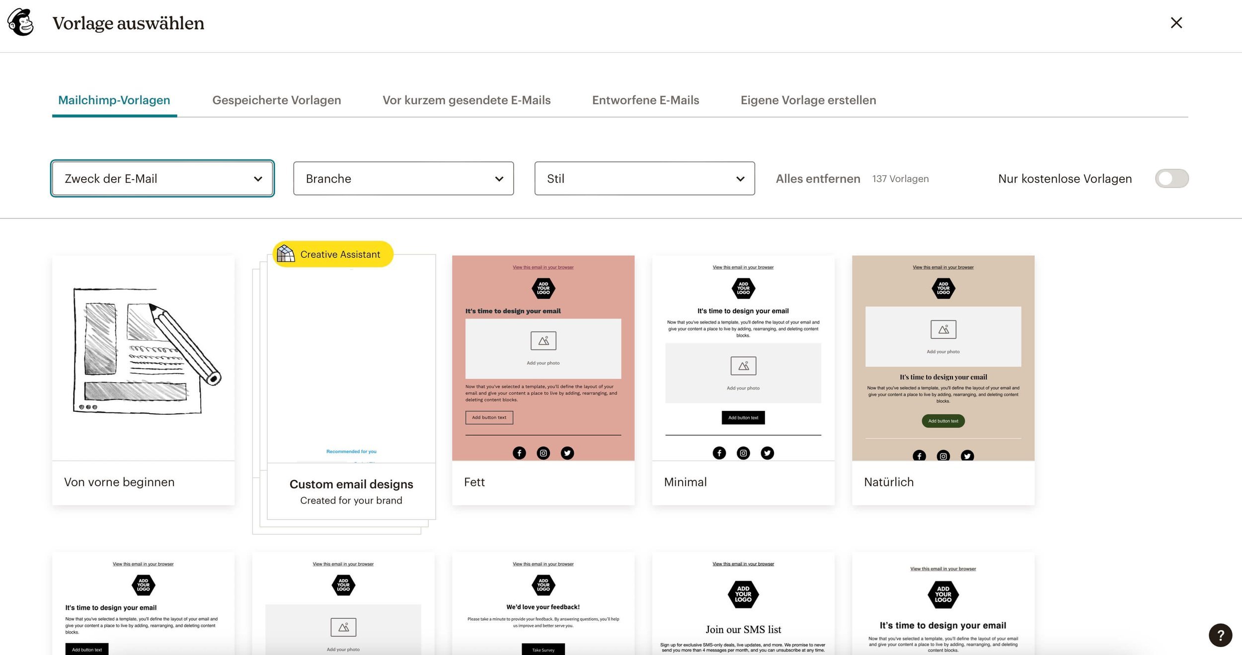 Du kannst sie sogar nach Zweck, Branche und Stil filtern. Das finden wir mega hilfreich. So hast du schnell das Passende gefunden.