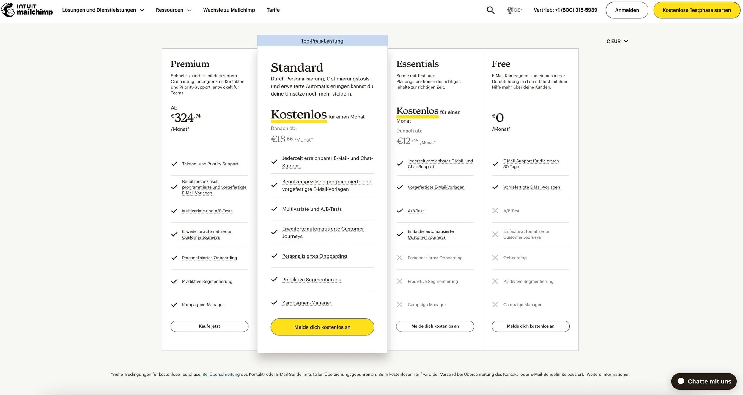 Bei Mailchimp hast du die Wahl zwischen vier Paketen: Free, Essentials, Standard und Premium.