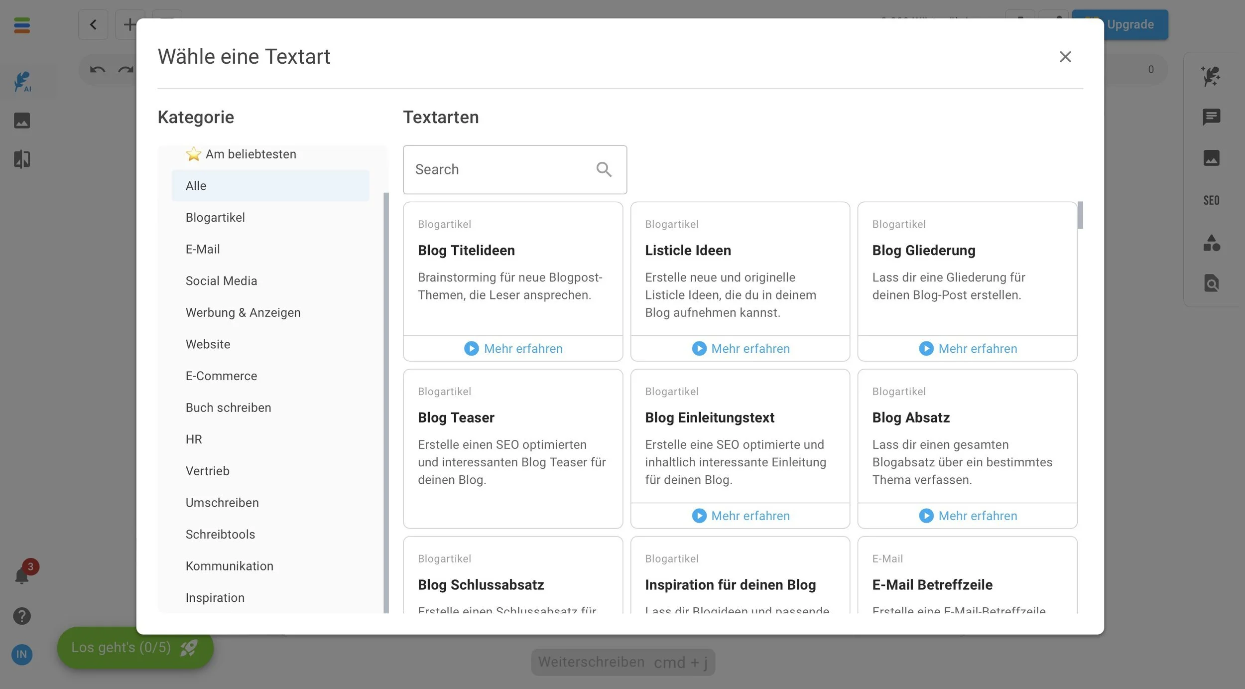 Du kannst dir aus über 100 verschiedenen Texttypen eine für dich passende Textart (oder auch Template) aussuchen und mit dem Texten loslegen.