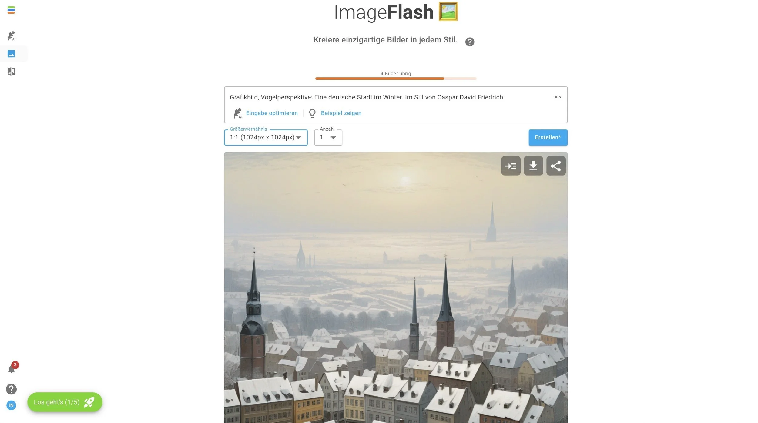 Wir finden es mega hilfreich, dass du beim ImageFlash auch auf “optimiere meine Eingabe” klicken kannst - dann hilft dir das KI-Tool nämlich deinen Prompt zu optimieren.