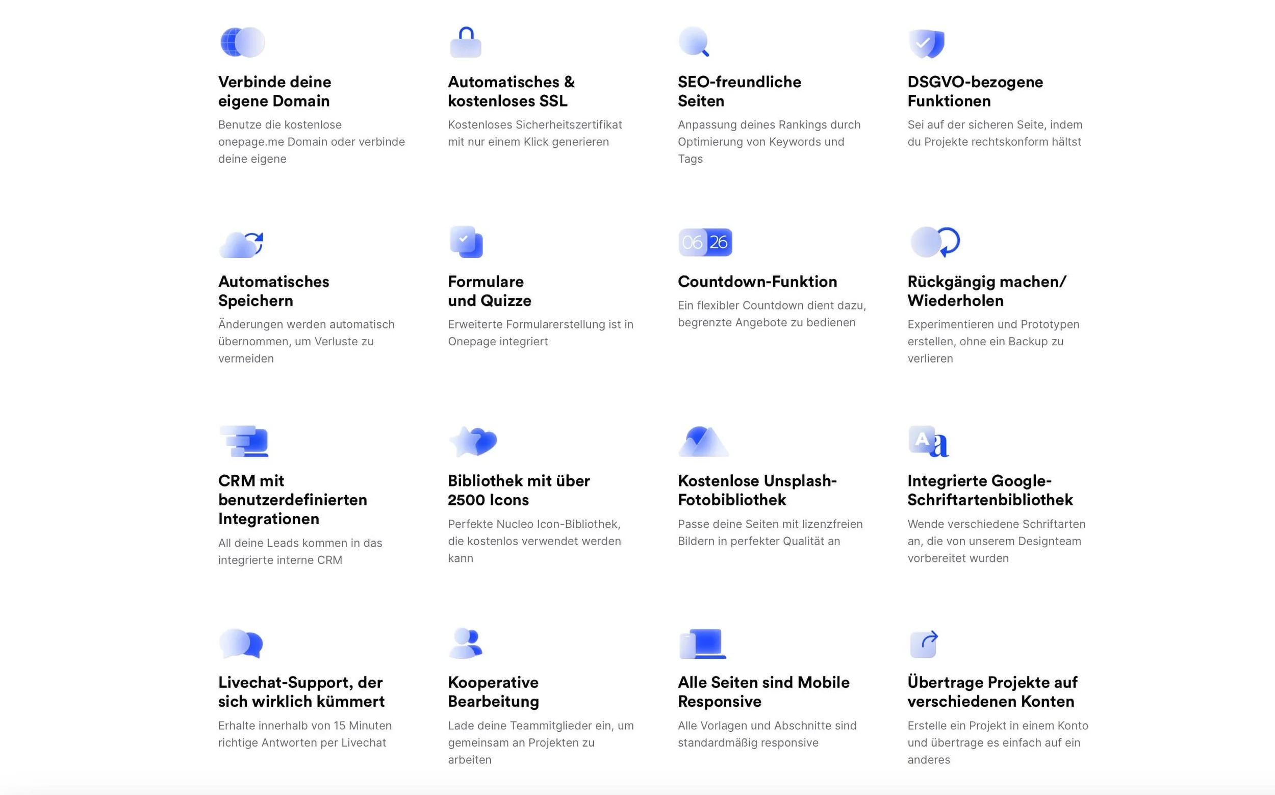 Aber schauen wir uns die Features von onepage.io mal genauer an. 👇