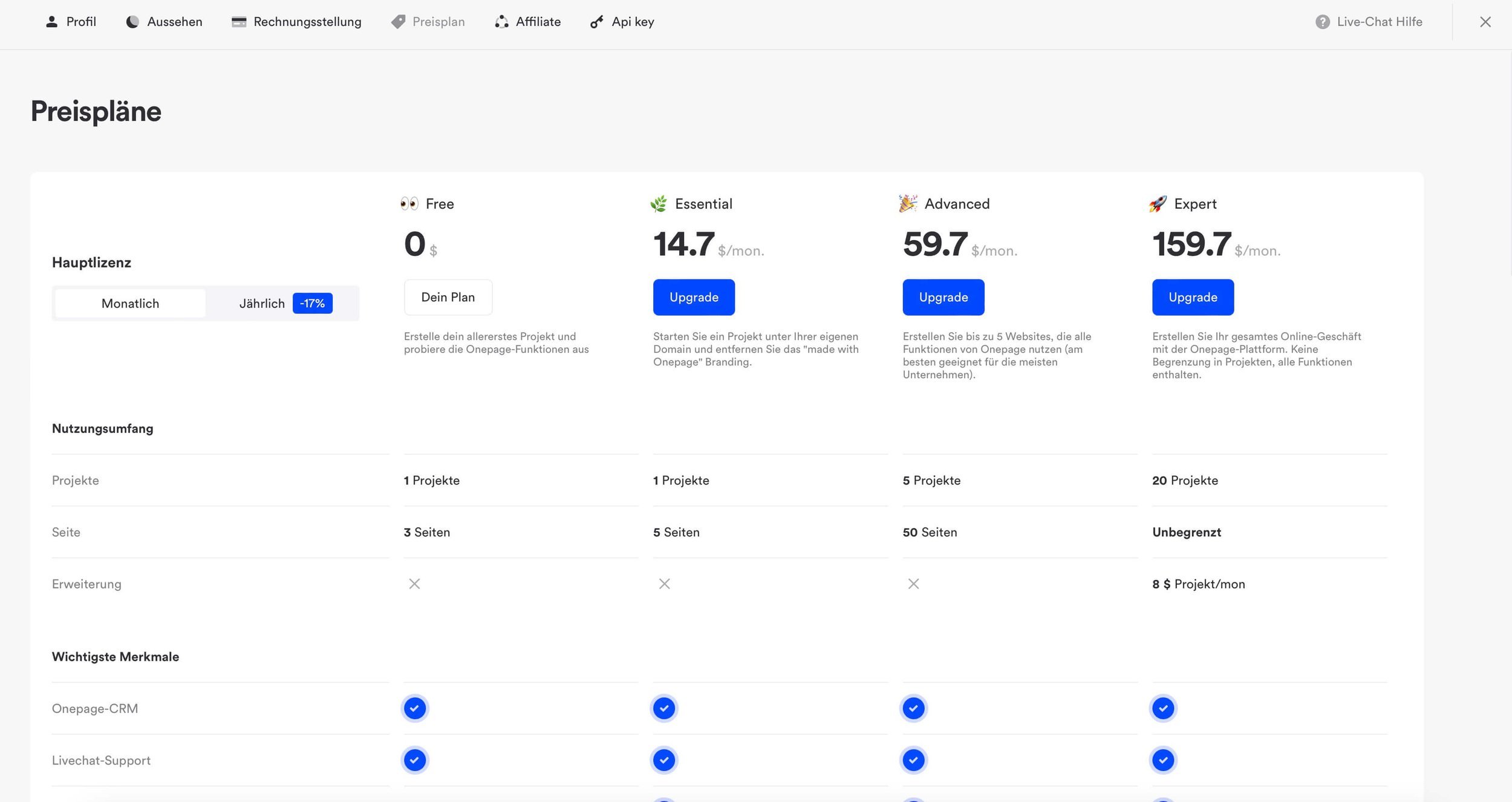 Du kannst zwischen vier Paketen bei Onepage.io wählen: Free, Essential, Erweitert und Experte.