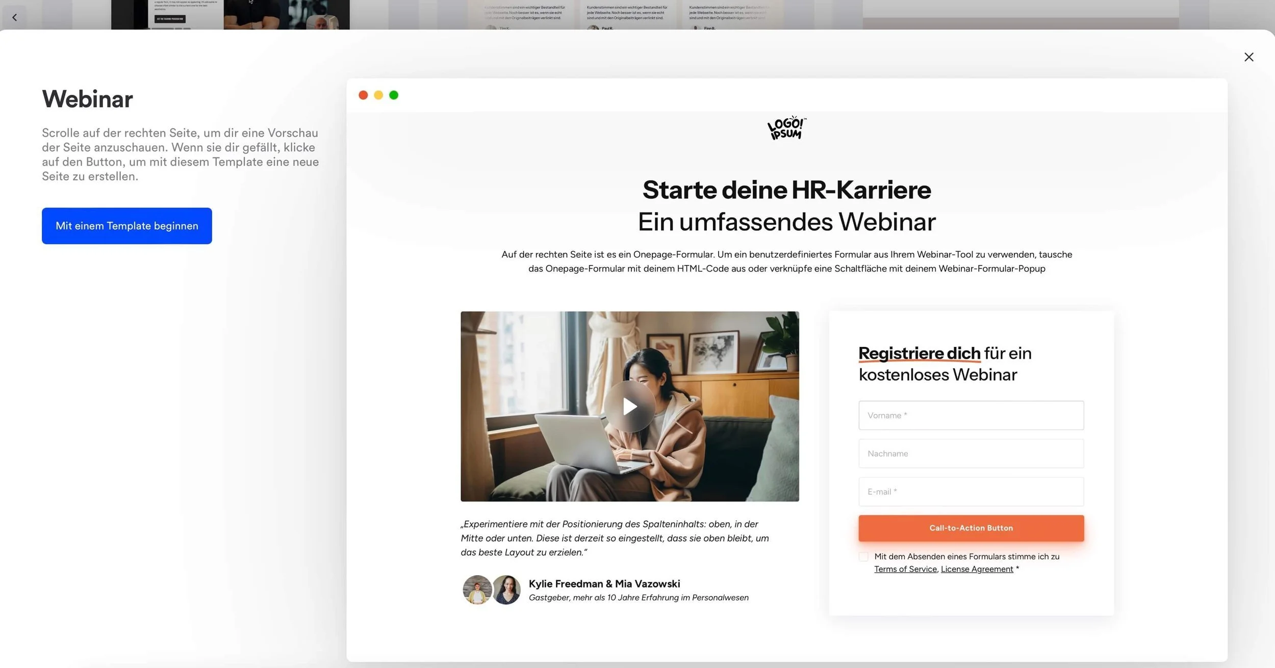 Und dann legst du schon los, dir deine Website zu designen. Du kannst dir aus den Templates etwas aussuchen und dann jedes einzelne Element in deinem Template individuell bearbeiten.