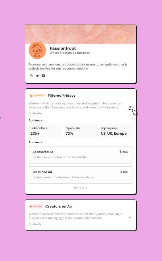 Passionfroot ist ein verrückt vielseitiges Tool, mit dem du feste Anzeigenplätze, Features und mehr in deinem Content verkaufen kannst. Ohne dass du jedes Mal neu verhandeln musst.