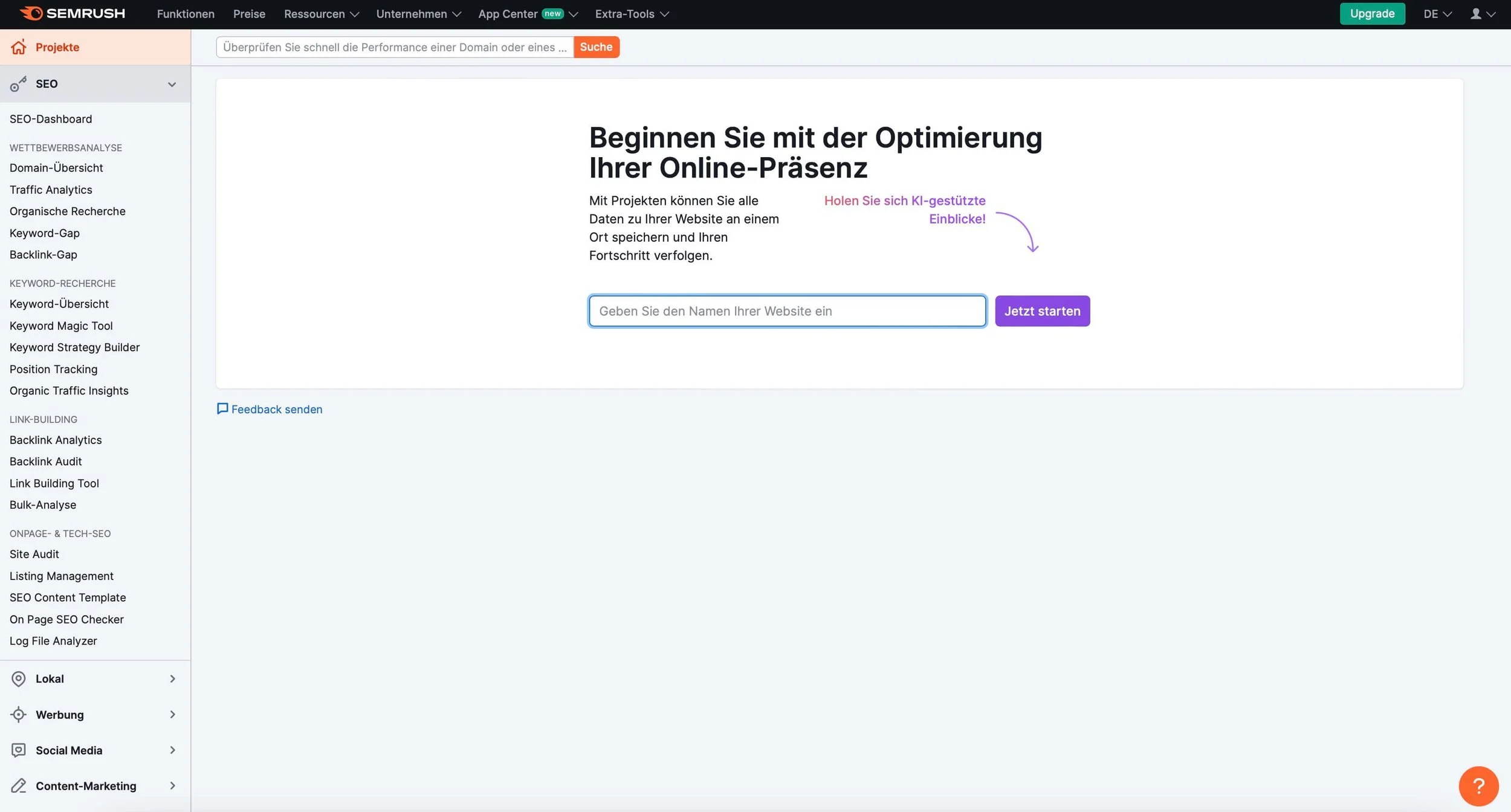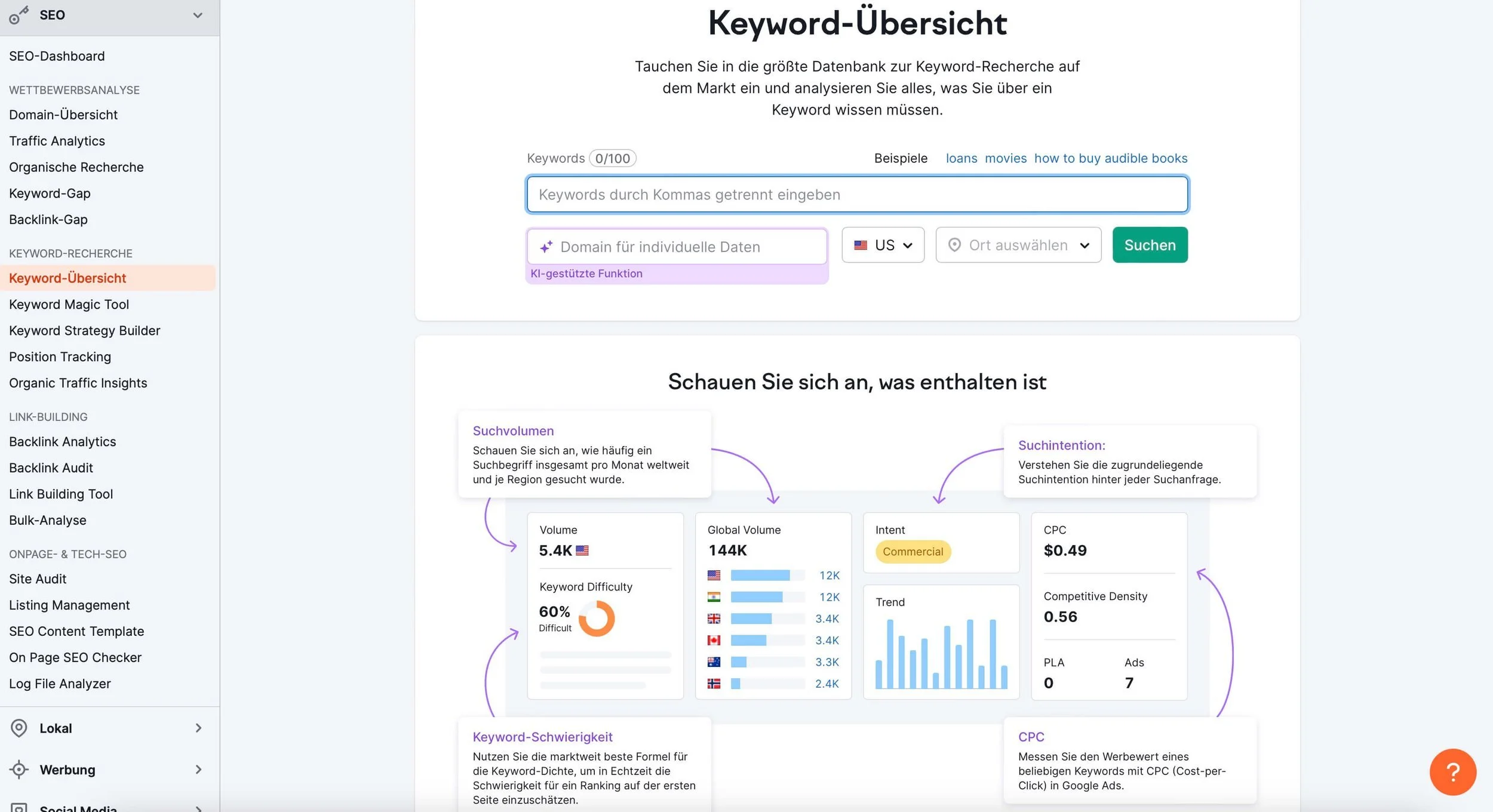 Hier gibt es die Keyword Recherche (mit einer beeindruckend gefüllten Keyword- und Geo-Datenbank übrigens) und zahlreiche Möglichkeiten, die Performance deiner Website (und die deiner Mitbewerber übrigens auch) auszuwerten und zu analysieren.