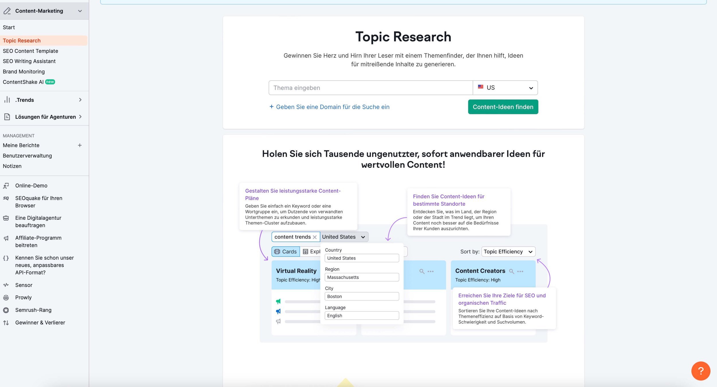 Es gibt Content-Templates, die bereits SEO-optimiert sind und die du nutzen kannst (oder auch zur Inspiration, up to you), um deinen Content zu erstellen. Ein weiteres Tool hilft dir dabei, die richtigen Themen für deinen Content zu finden.