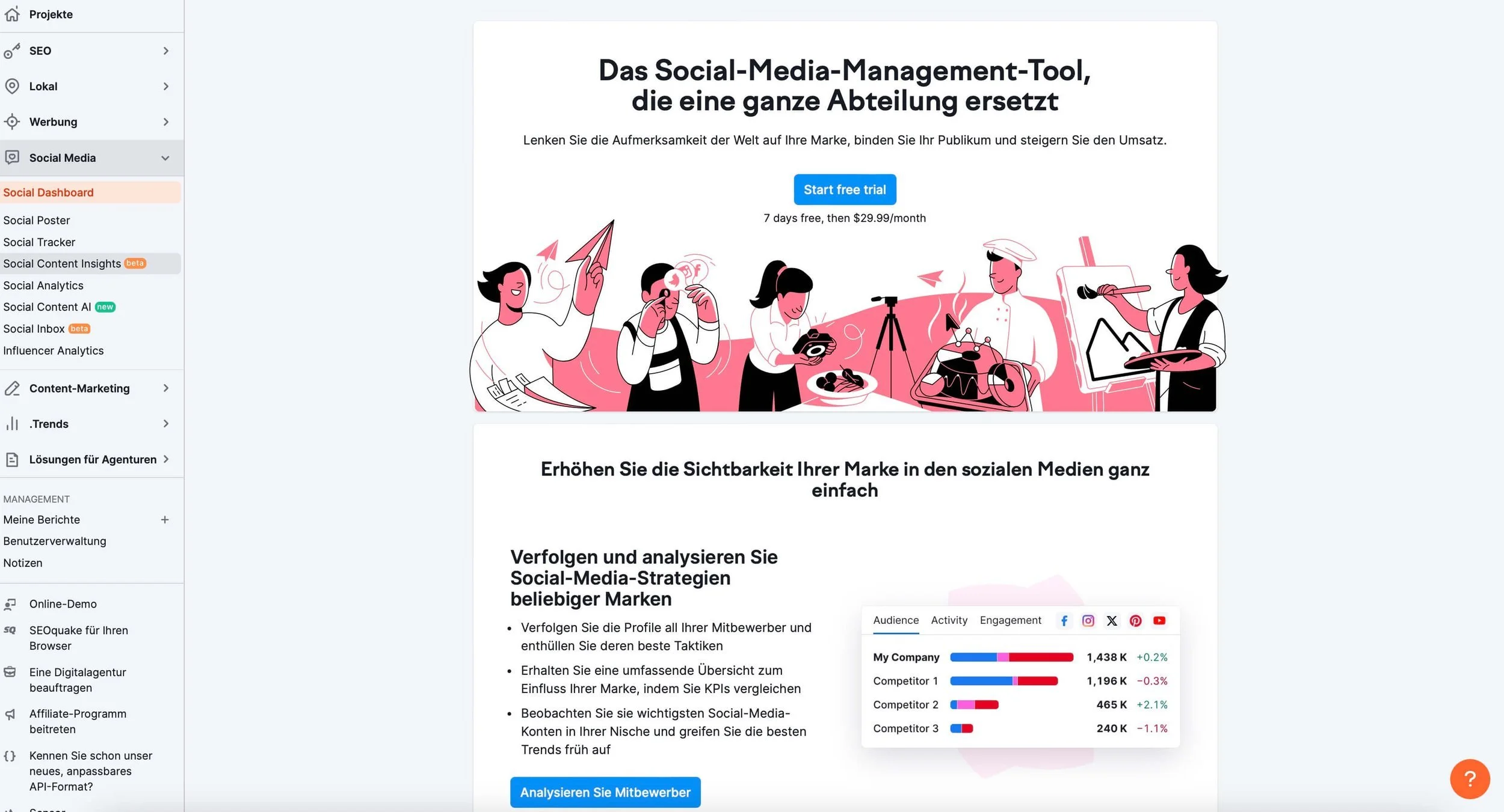 Denn in dieser Kategorie kannst du alle deine Social Media Kanäle an einem Ort verwalten. Das beginnt damit, dass du deine Community mit SEMrush verwalten kannst (Kommentare, Nachrichten und Co. landen alle in einer Inbox) und endet damit, dass du deine Posts mit SEMrush auch planen und veröffentlichen kannst. Aber nicht nur das!
