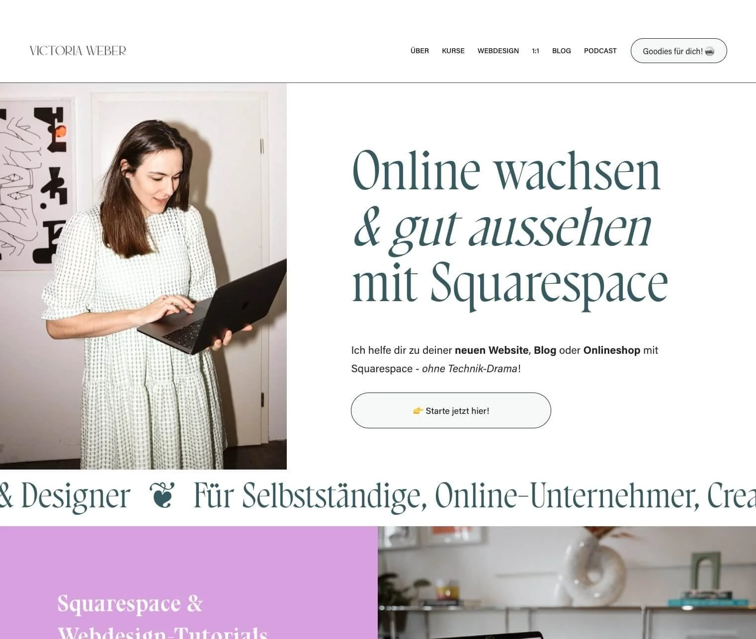 Es gibt von Victoria einen gratis Blog mit über 320 Artikeln und Squarespace-Tutorials, außerdem einen Youtube-Kanal über Squarespace und “Website mit Plan”, Victorias großen Squarespace-Onlinekurs. Und eine Webdesign-Agentur mit Templates hat sie auch noch - wenn du zu denen gehörst, die keine Zeit haben, und das einfach machen lassen willst.