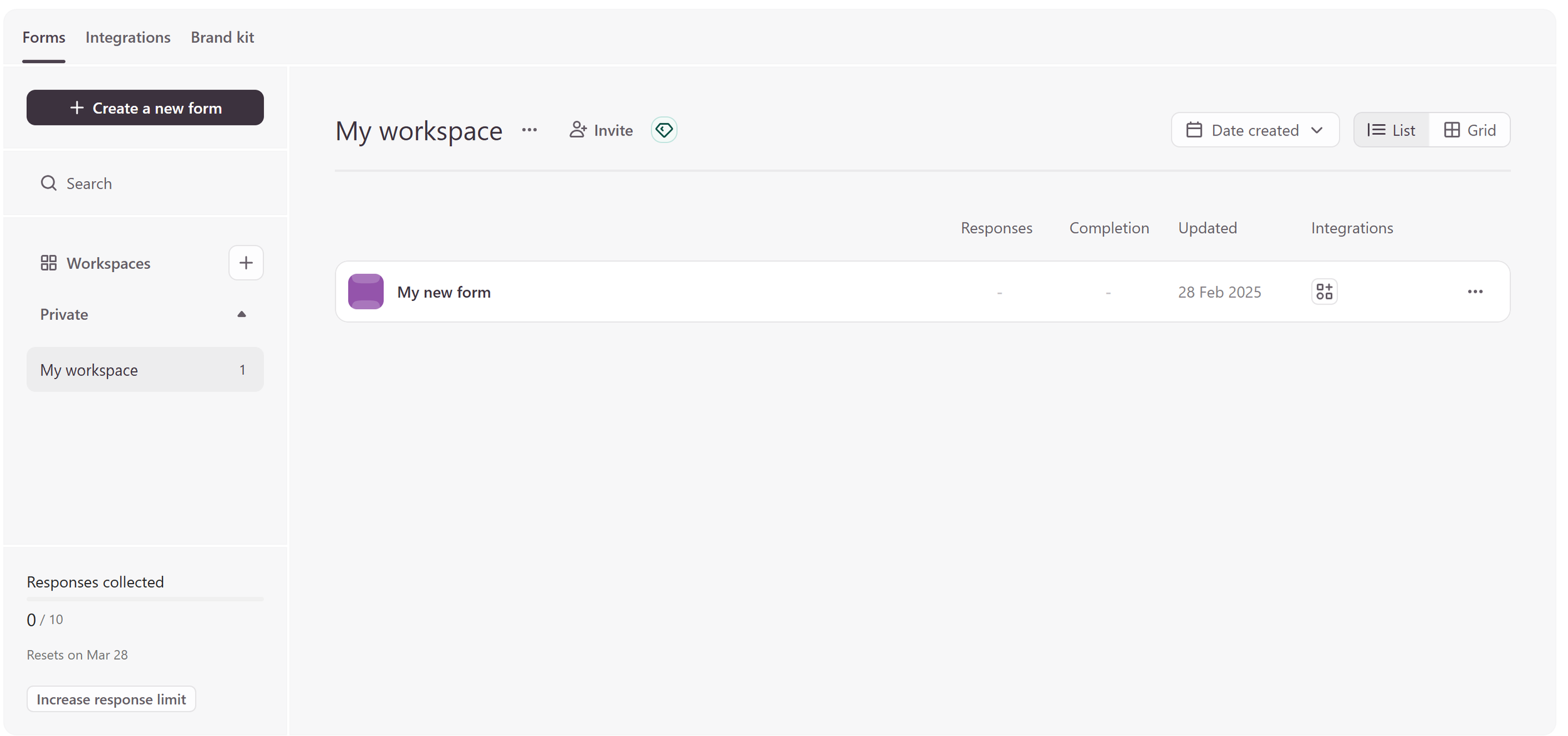 Beim Dashboard hast du die Übersicht über deine ganzen Formulare und kannst verschiedene Workspace erstellen - zum Beispiel für unterschiedliche Projekte.