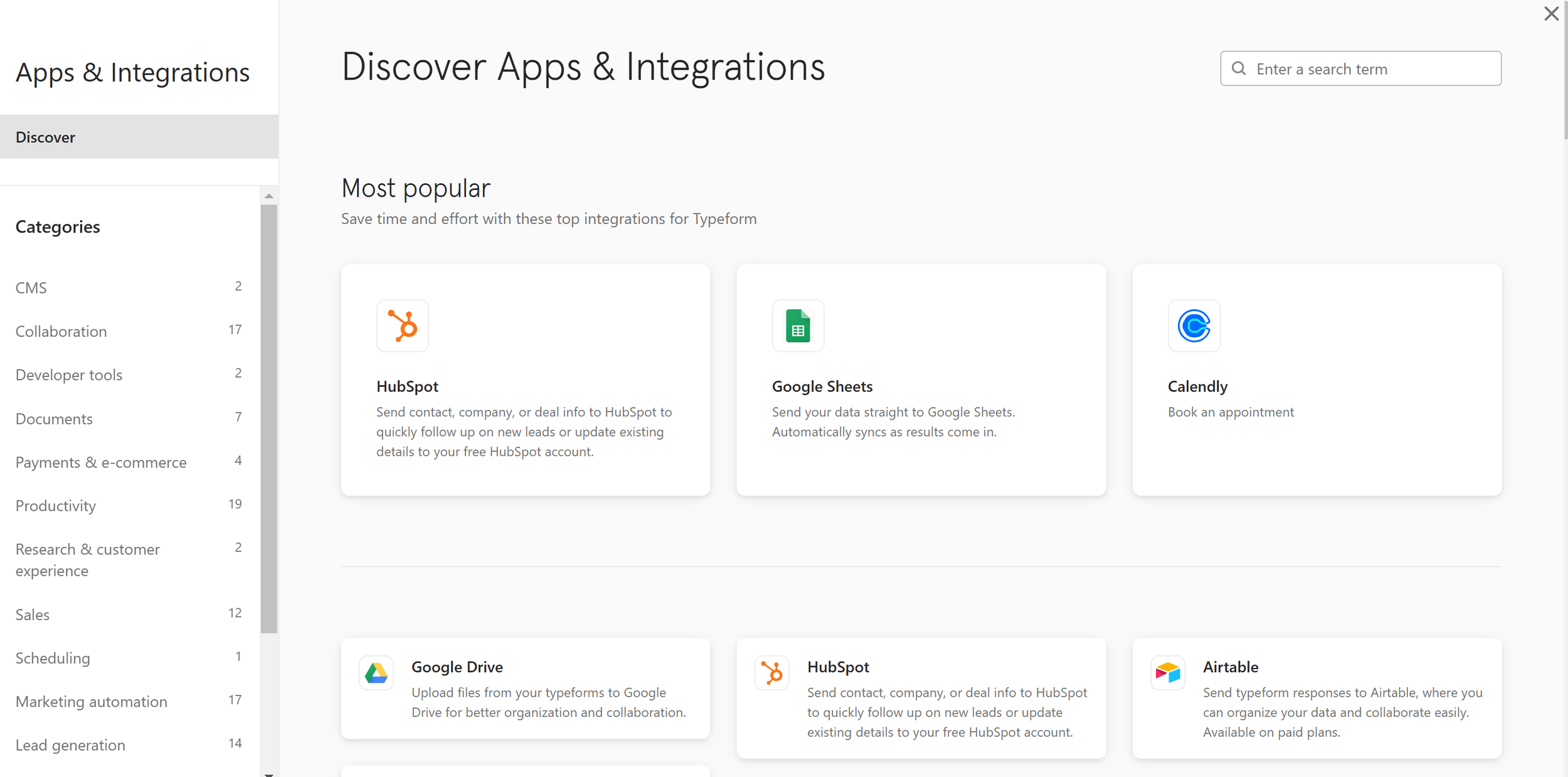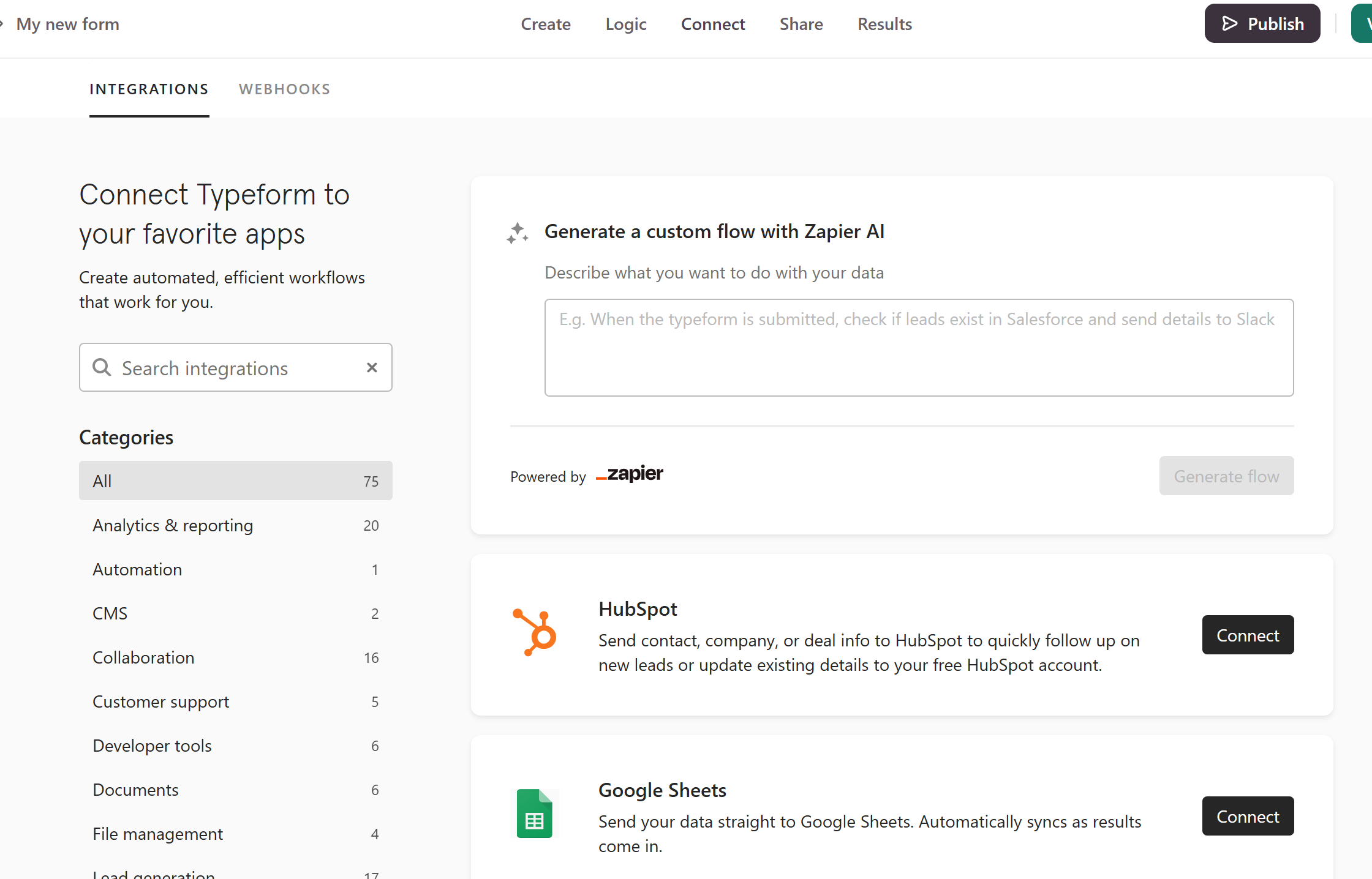 Außerdem bietet Typeform zahlreiche Integrationen, sodass du die gesammelten Daten direkt in deine gängigen Tools einbinden kannst – zum Beispiel mit Zapier, Airtable, Slack oder Google Sheets.