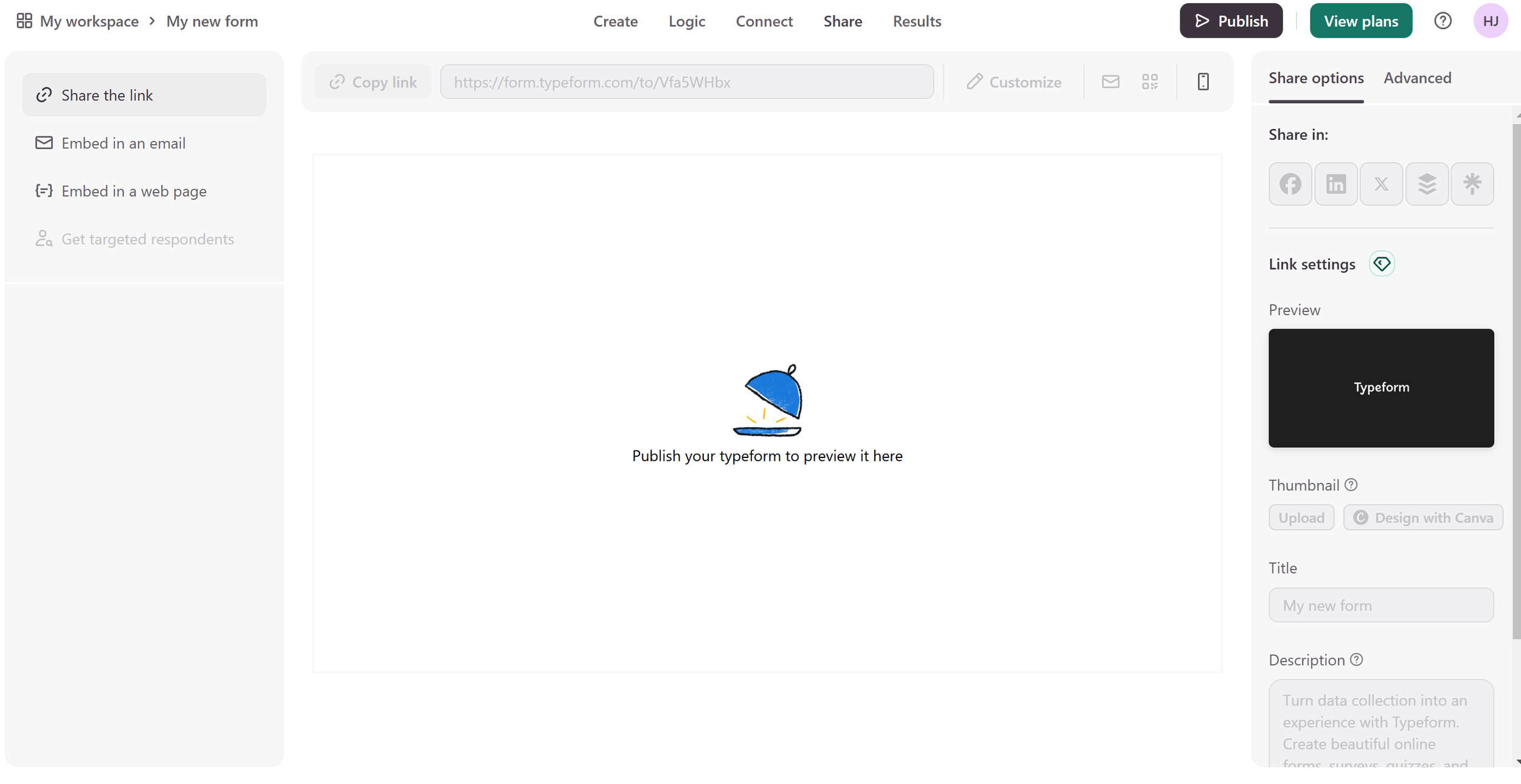 Du kannst dein fertiges Formular nun auf deiner Website, auf Social Media oder in deinem Newsletter einbinden. Zum Teilen klickst du einfach “Publish” und Typeform erstellt dir einen Link (leider kannst du den nur mit einem Plus oder Business Plan anpassen).